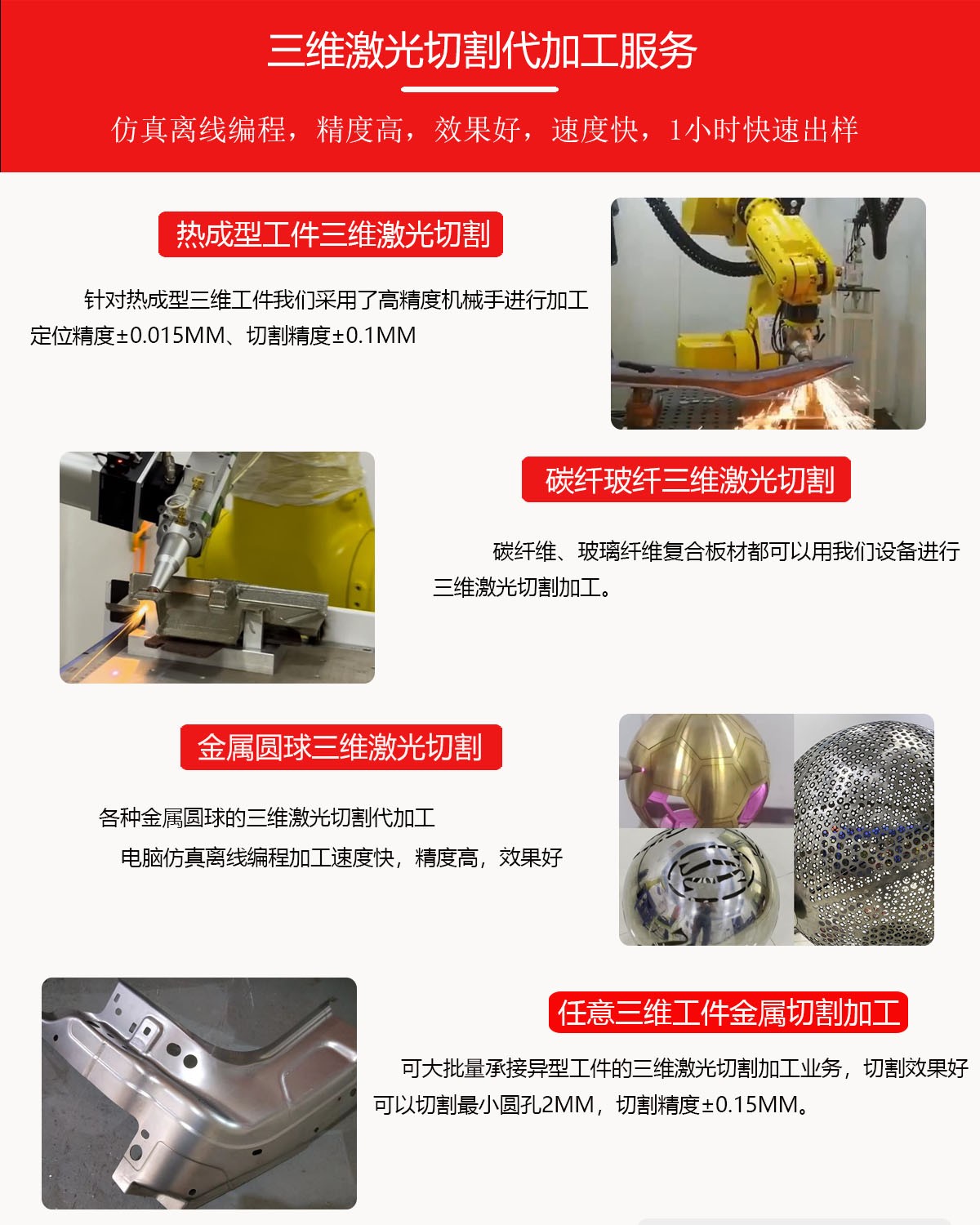 异型金属工件三维激光切割代加工业务主要是满足部分客户需要切割的产品数量不多,不想购买设备,或者是前期由我们代为加工,后期再购买设备。